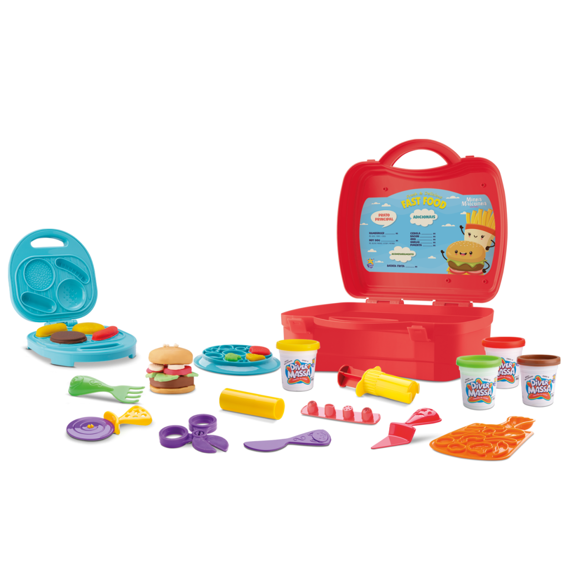 temperos, 1 maleta, 1 rolinho, 4 Potinhos de massinhas 50gAo abrir a maleta,