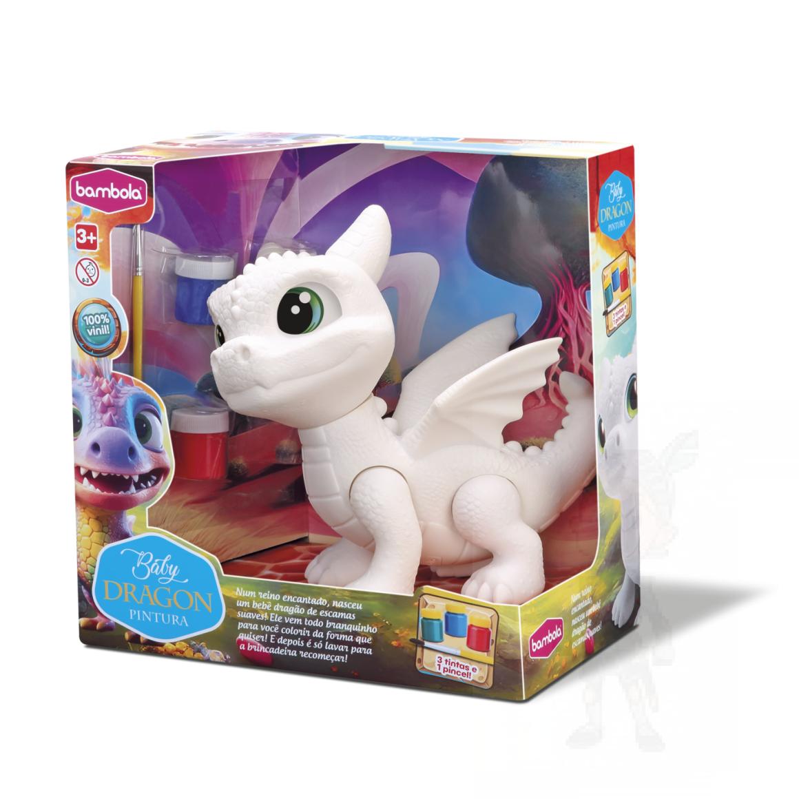 O kit completo inclui o boneco Baby Dragon, tintas vibrantes e um pincel,