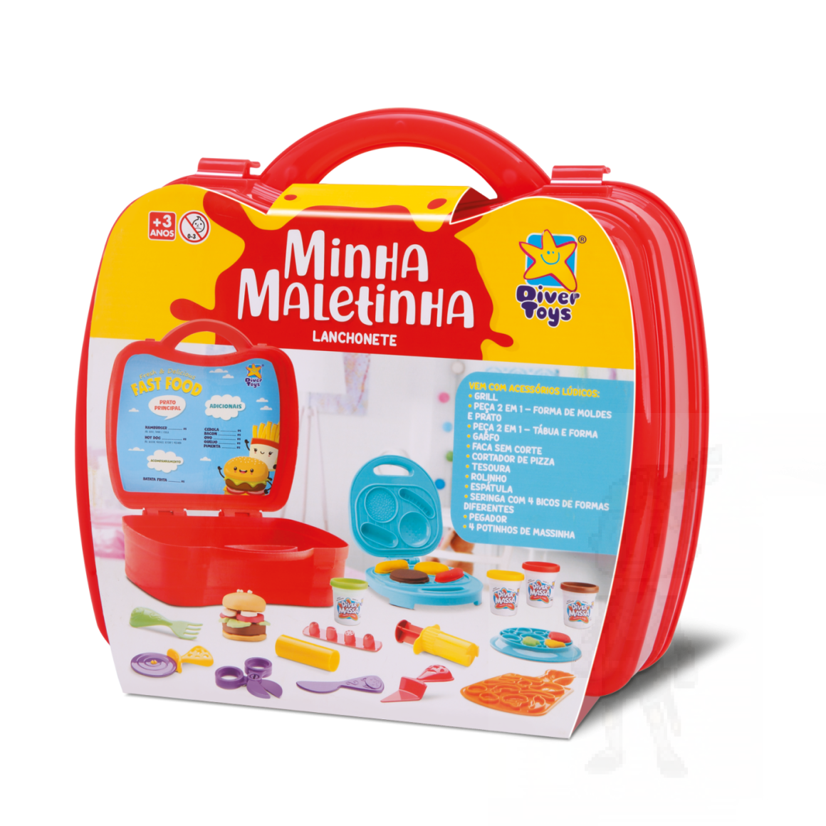 temperos, 1 maleta, 1 rolinho, 4 Potinhos de massinhas 50gAo abrir a maleta,
